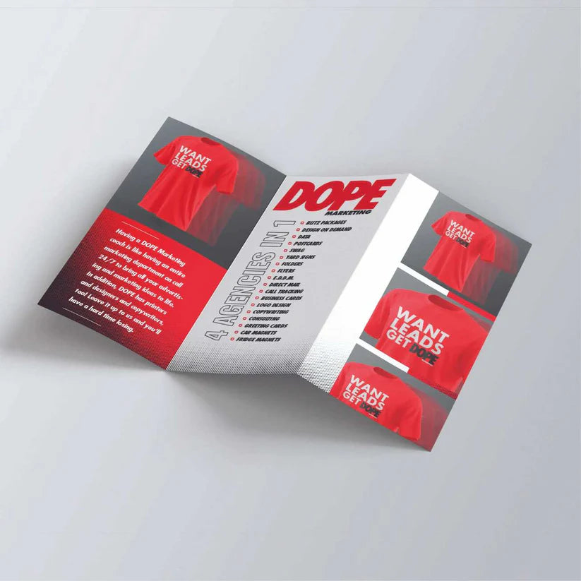 We will say it over and over again… the DOPEST industry is the one you have a passion for. You are passionate about your business. We are passionate about helping your business with a killer campaign. A good way to do that? With A DOPE Marketing Tri-Fold Brochure! Your DOPE Marketing coach will personally direct the DOPE design team to make sure your company stands out on paper, just like it does in life.
